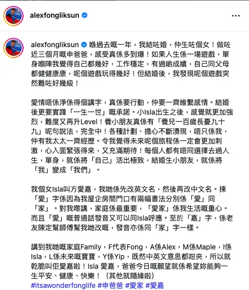 佢續說:「我哋嘅家庭Family,F代表Fong,A係Alex,M係Maple,I係Isla,L係未來嘅寶寶,Y係Yip,既然中英文意思都咁夾,所以就乾脆叫佢愛嘉啦!Isla 愛嘉,爸爸今日嘅願望就係希望妳能夠一生平安、健康、快樂!(其他就隨緣啦)」似乎方力申已為下胎做好準備,不少圈中好友也指感受到其那份做爸爸的喜悅之情。