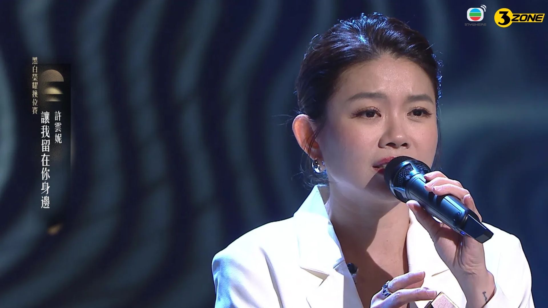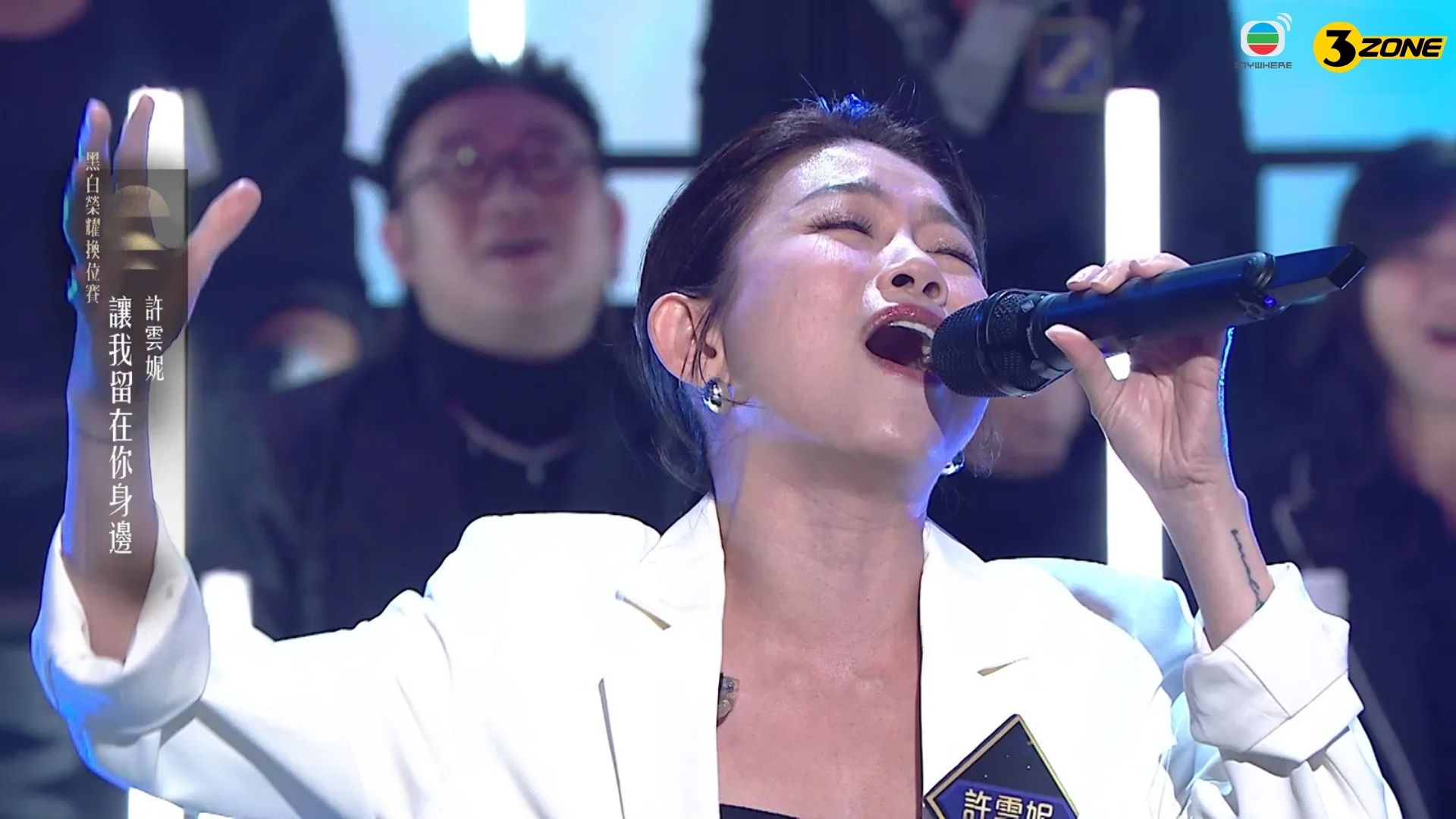 下弦白隊嘅許雲妮今集獻唱《讓我留在你身邊》,唱功夠紮實,加上真摰嘅演繹,感動到全場。佢話自己好鍾意歌入面其中一句「最渺小的我有大大的夢」,想送畀每一位需要打氣嘅朋友。雲妮亦開心講到,一班大馬老友專程飛嚟香港撐場,大家識咗超過二十年,後生嗰陣仲一齊喺民歌餐廳演出,感情好深。佢仲搞笑話:「成班馬來西亞朋友特登飛過嚟睇我㗎,但機票冇得報銷㗎!」即刻引到全場大笑。