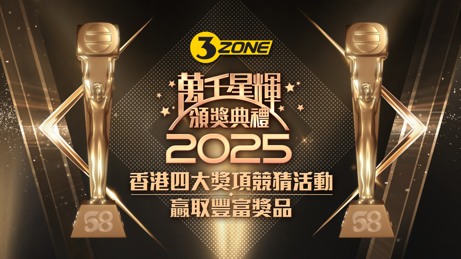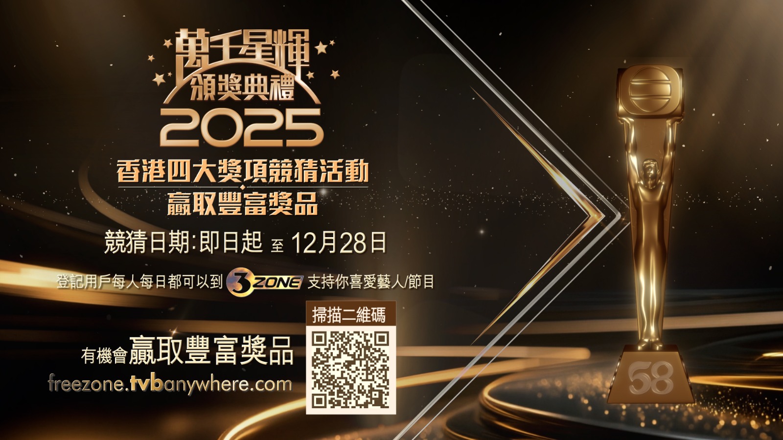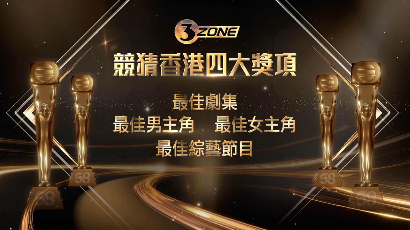 TVB Anywhere 誠邀海外觀眾參與3ZONE 「香港四大獎項競猜活動」,獎項包括「最佳男主角」、「最佳女主角」、「最佳劇集」、「最佳綜藝節目」。