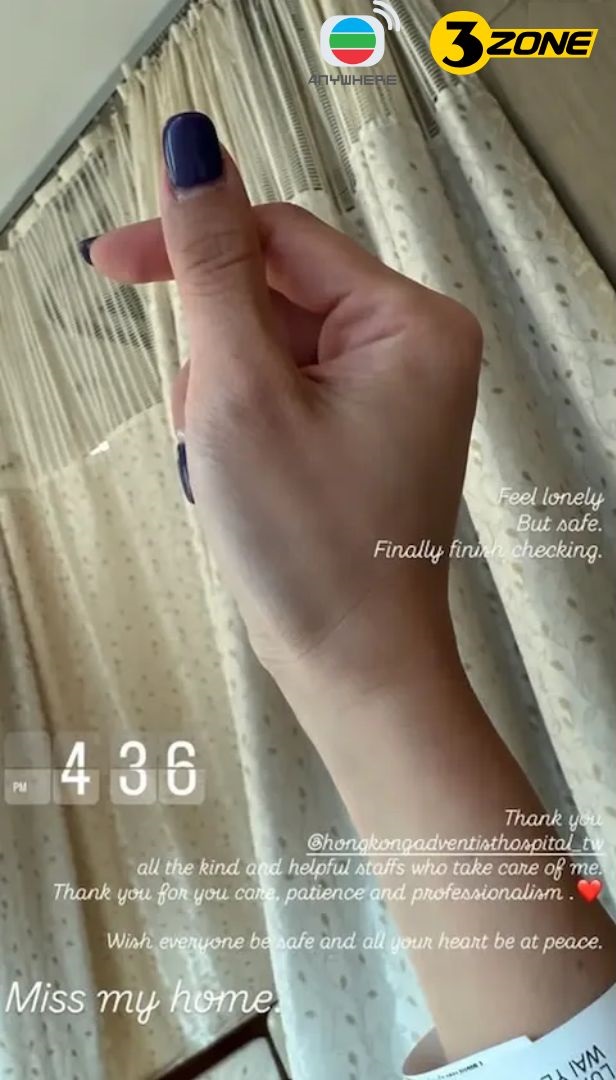 此外,呂慧儀月初曾在社交網上分享病床照片,驚爆自己身處醫院,當時她手腕上戴著病人手帶,直言感到孤單,非常想念家中。雖然未透露入院的具體原因,但她感謝醫護人員的悉心照顧,並表示已完成身體檢查。