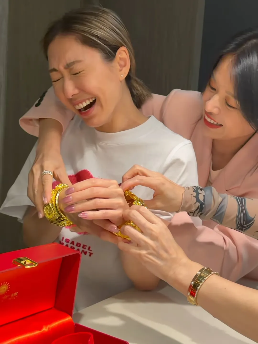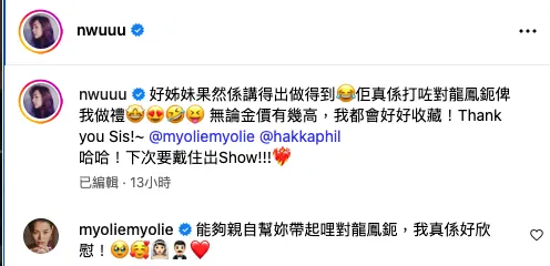 日前,胡定欣與胡杏兒、陳山聰夫婦、袁偉豪夫婦及單立文夫婦聚會,胡杏兒特意送上了一對斤兩十足的巨型流星錘龍鳳鈪作為禮物,令胡定欣感動不已。她在社交媒體上表示:「好姊妹果然係講得出做得到,無論金價有幾高,我都會好好收藏!Thank you Sis!~」