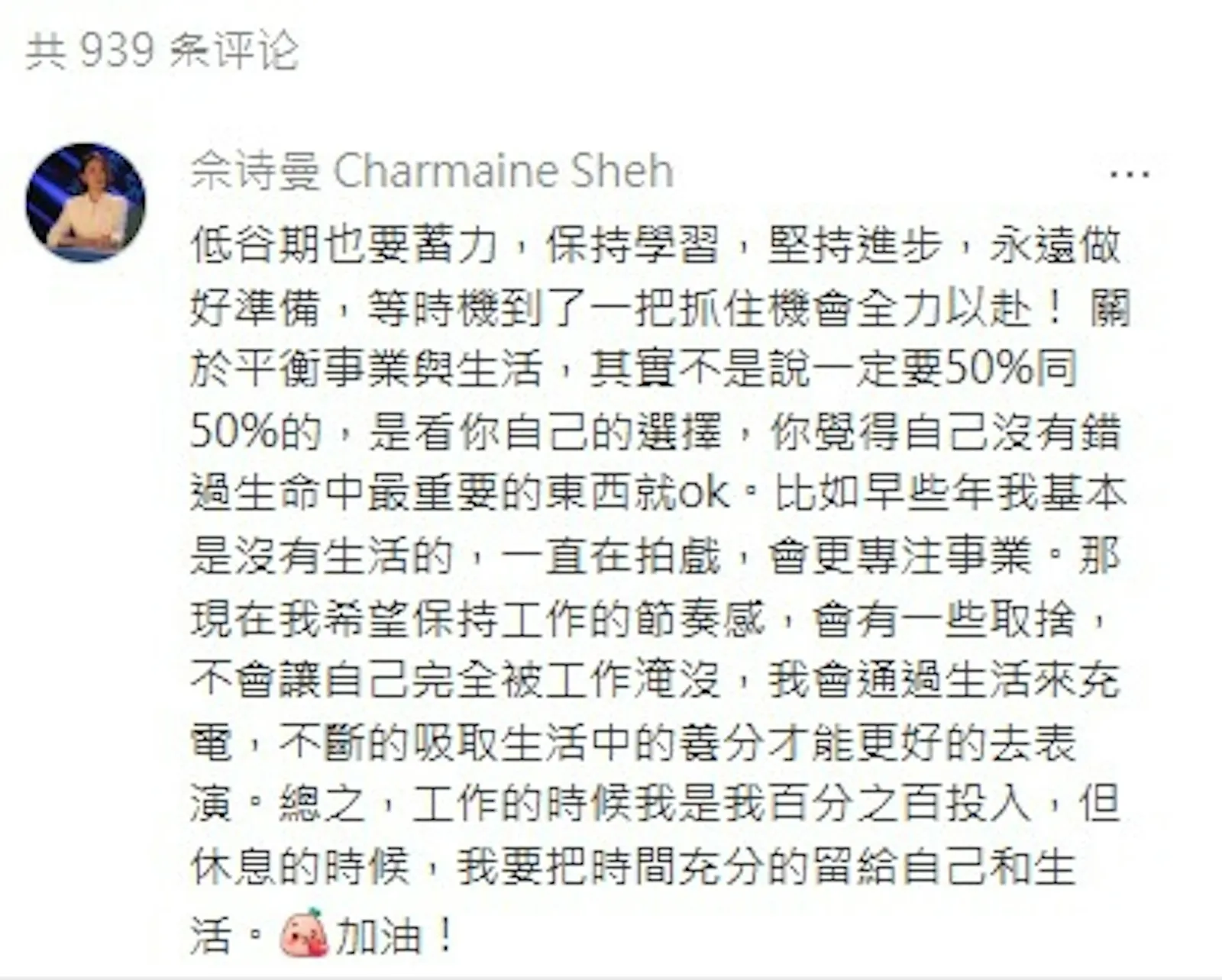 她表示,平衡不是一定要50%對50%,而是根據個人選擇來調整。早年間她專注於事業,現在則希望能夠有所取捨,並重視生活中的充實與休息。佘詩曼強調,只有充實生活,才能更好地投入表演,並再次鼓勵粉絲要加油!